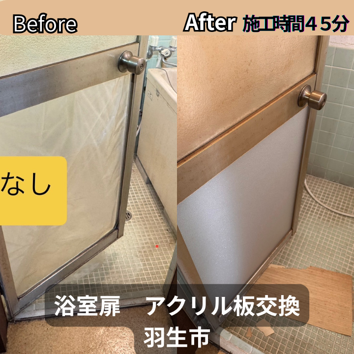 修繕工事にあたり、浴室扉のアクリル板が割れているため交換してほしいとのご相談でした。