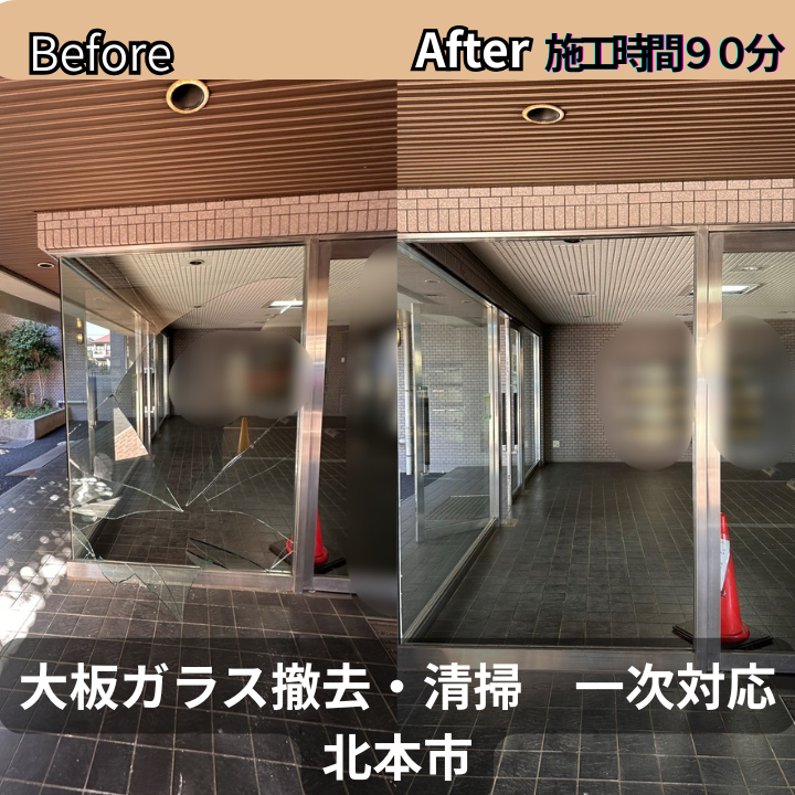 北本市にて、マンションエントランスの大板ガラス撤去および清掃の一次対応をご依頼いただきました。
