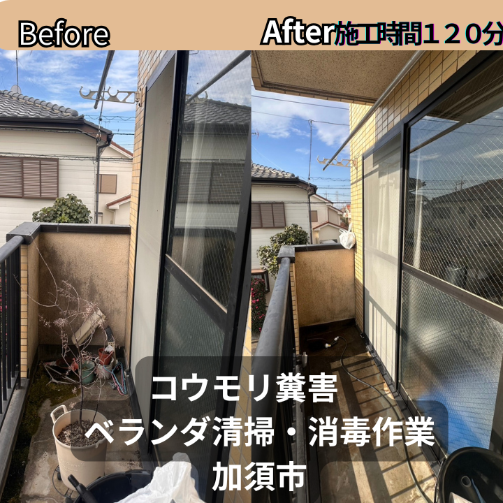 加須市のお客様より、コウモリの糞害によるベランダ清掃・除菌作業をご依頼いただきました。
