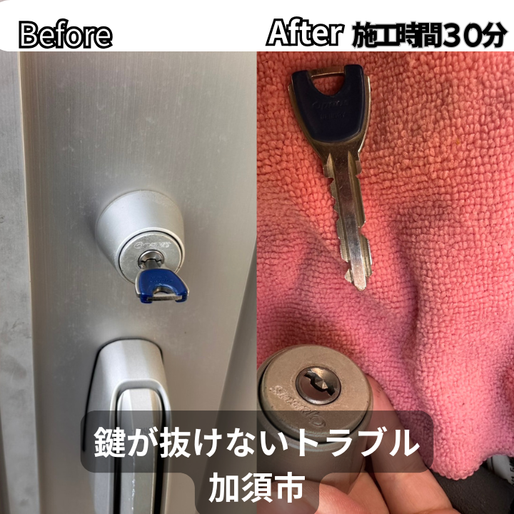 加須市にて、鍵が抜けなくなったトラブルの解消およびメンテナンス作業をご依頼いただきました。