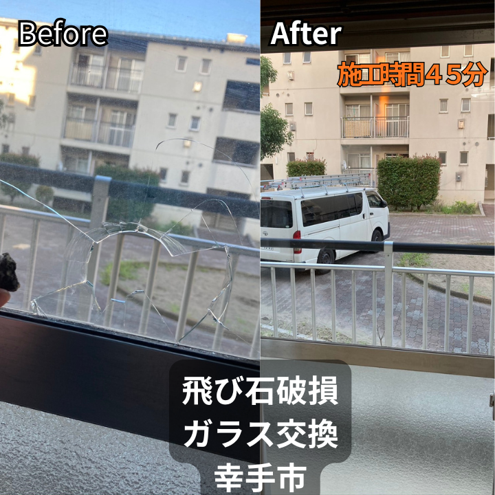 【幸手市】投石によるガラス破損を交換しました|45分で復旧