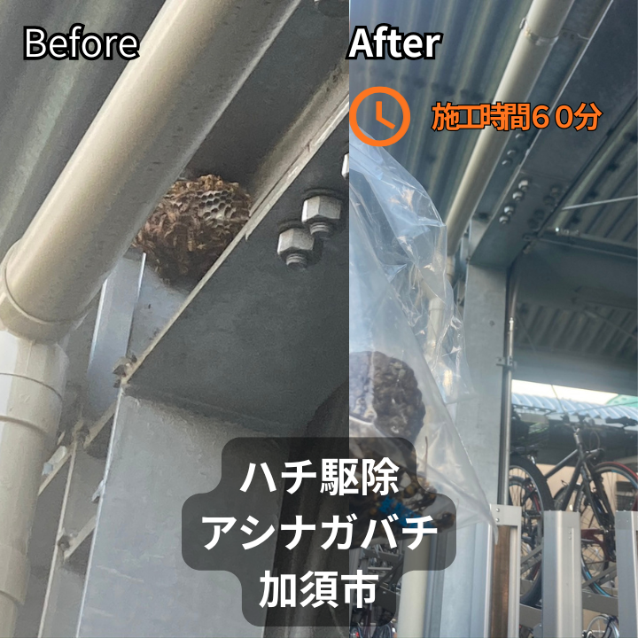 加須市にて駐輪場にできたアシナガバチの巣を駆除しました!