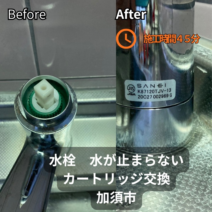 【加須市】キッチン水栓の水が止まらないトラブルに対応|カートリッジ交換で水漏れ解消