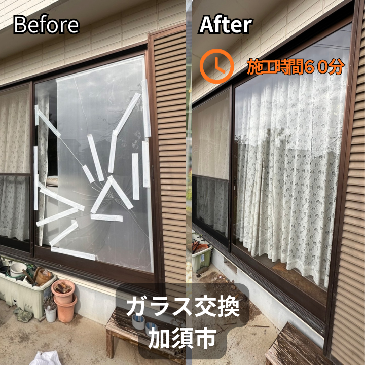 【加須市】大きなガラスが割れた際の応急処置と交換対応事例