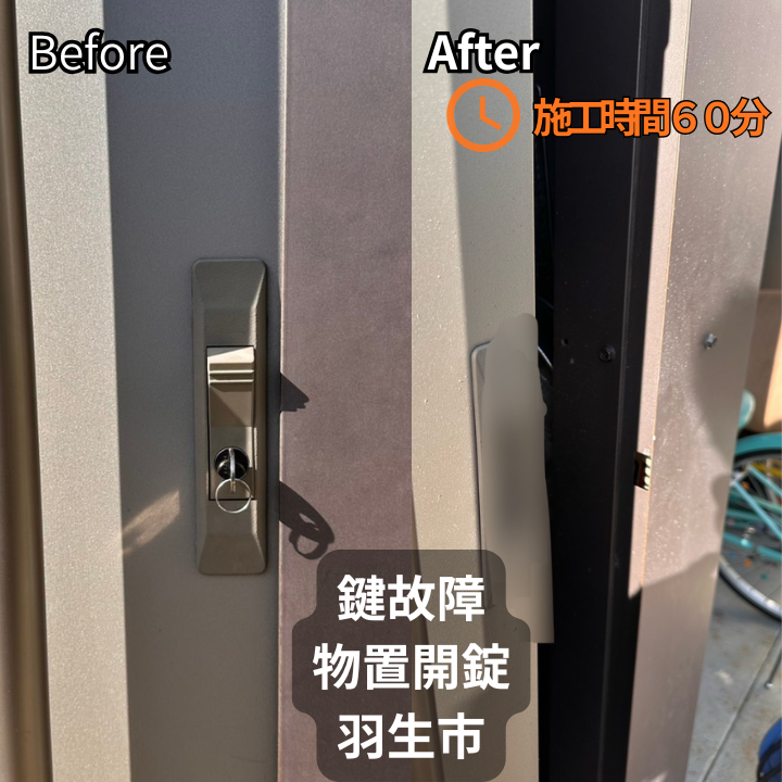 羽生市にて物置の鍵故障による開錠作業を行いました。