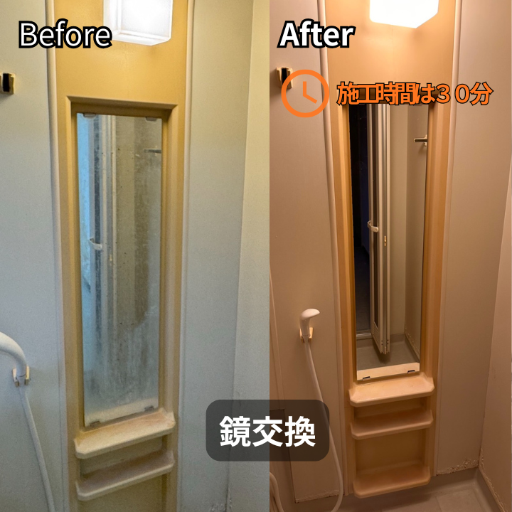 既存の鏡を安全に取り外し、ミラーマットを貼りつけ新品の鏡へと交換させていただきました。